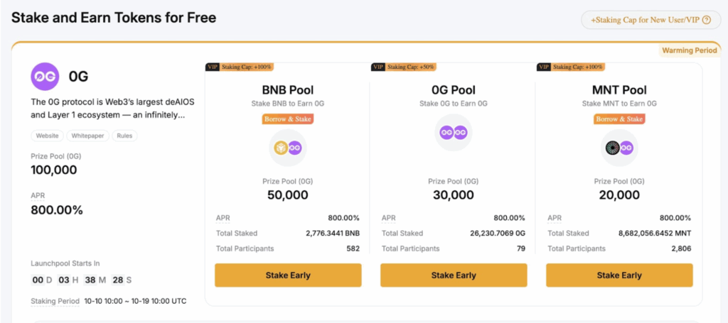 Bybit recently rolled out a new launchpool for OG token. With a total reward pool of 100,000 OG tokens, users can utilise either of the three staking options available to maximise profit: BNB(16.94% APR), 0G(182.83% APR), and MNT(2.73% APR).